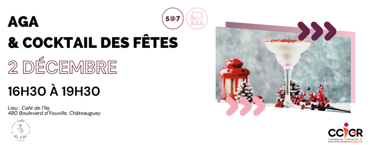 La Chambre de commerce et d’industrie du Grand Roussillon est heureuse de vous inviter le 4 décembre prochain pour l’assemblée générale annuelle (AGA) suivie du Cocktail des Fêtes!
