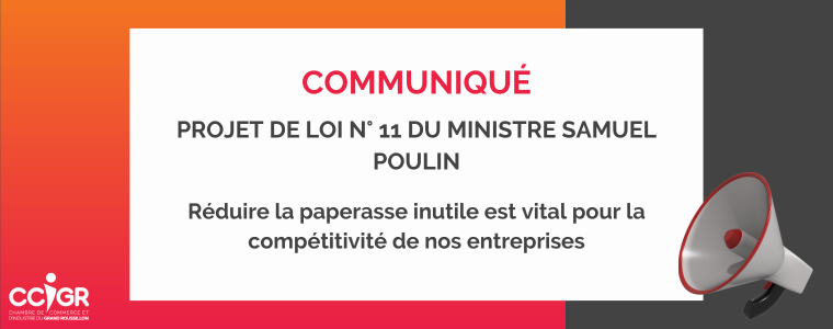 Châteauguay, le 4 décembre 2025 – La Fédération des chambres de commerce du Québec (FCCQ) et la Chambre de commerce et d’industrie du Grand Roussillon (CCIGR) sont satisfaites des nouvelles orientations contenues dans le projet de loi d’allègement réglementaire présenté par le ministre Samuel Poulin. Le principe de retirer au moins deux formalités administratives pour chaque nouveau règlement ajouté ainsi que le prolongement de la durée des permis et autorisations sont deux éléments importants que la FCCQ et la CCIGR réclamaient de longue date.