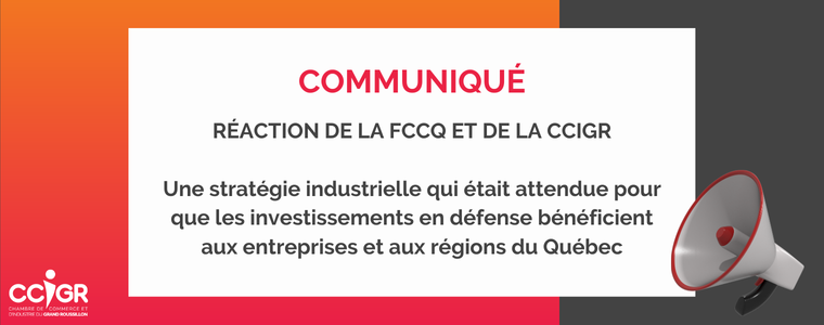 RÉACTION DE LA FCCQ ET DE LA CCIGR Une stratégie industrielle qui était attendue pour que les investissements en défense bénéficient aux entreprises et aux régions du Québec